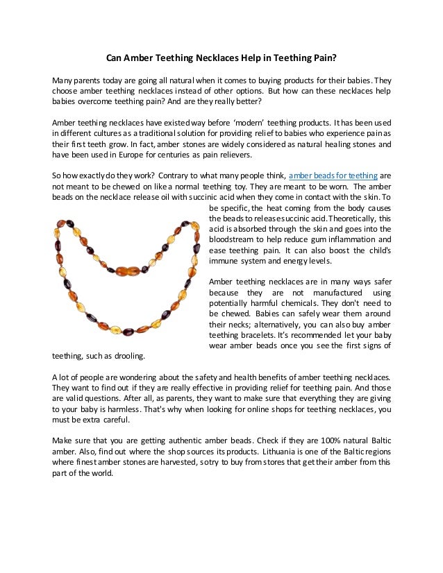 Does amber necklaces help teething. Teething necklaces and bracelets are made of amber wood marble or silicone. No doubt a child wearing an amber necklace would raise eyebrows as one may wonder whether it is safe. The succinic acid in theory gets absorbed into the bloodstream helping to easy babys pain.